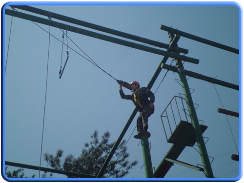 About 10 meters high in the sky there is a shaking of the horizontal bar. The horizontal bar on the left there is a iron pillars, about 30 cm in diameter. We climb the rock pillars, standing on top of a small disk, then jump to grab the horizontal bar.When we fasten the safety belt, so long as we dare to jump out. In the eyes of many people, in front of the horizontal bar is the touchstone of courage.