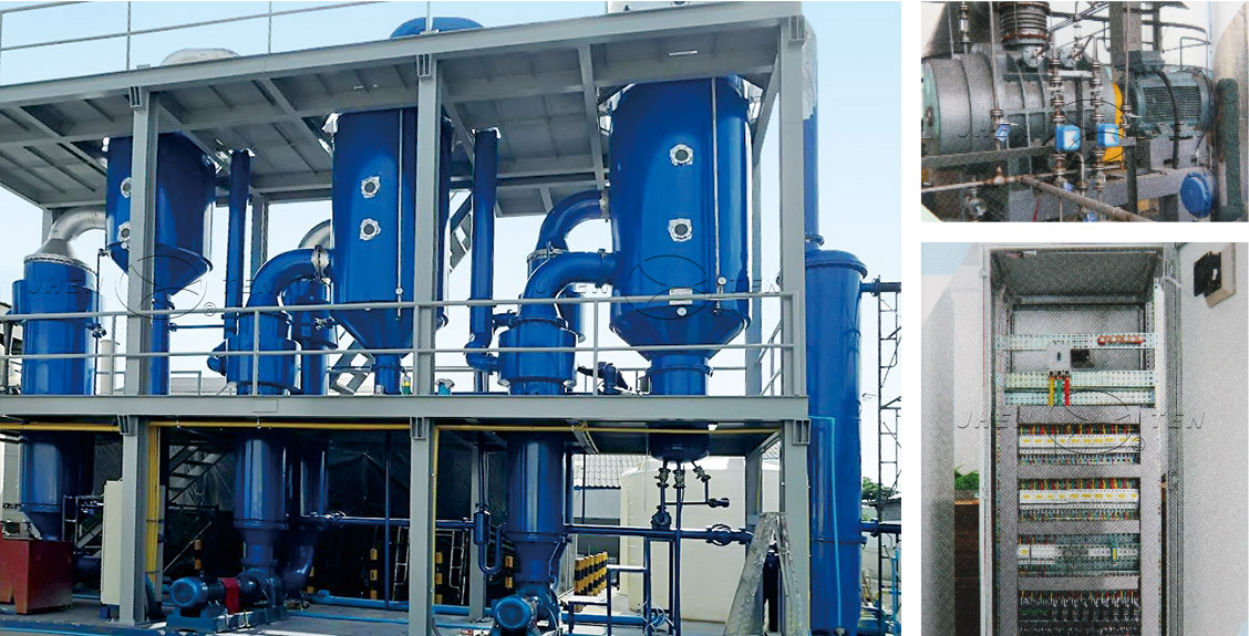 汽缸、各效加熱器、分離器、冷凝器(混合式或表?式)、各效強制循環(huán)泵、料液輸送泵、真空泵、冷凝?泵、操作平臺、電器儀表控制柜及界內(nèi)管道閥?等組成。